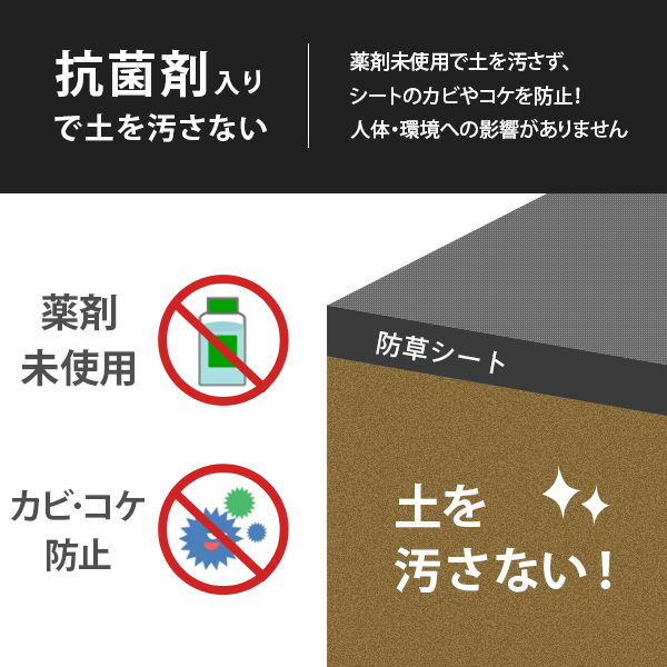抗菌剤入りでカビやコケなどの発生を防ぎます。薬剤未使用で土を汚さず、人体や環境にも影響もありません。