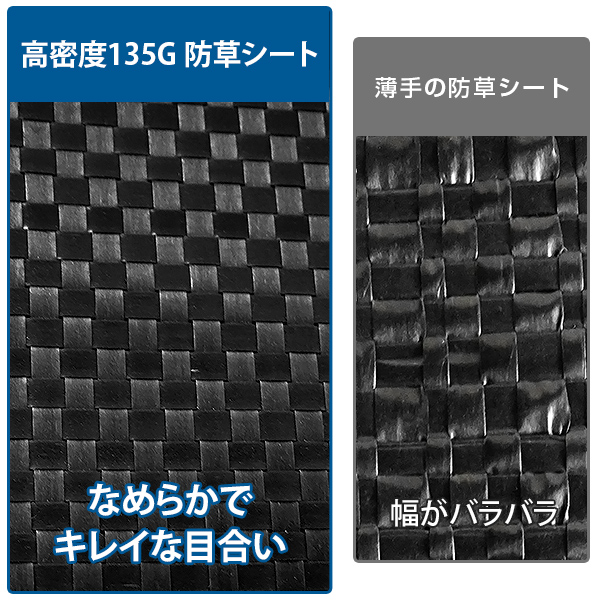 135g/m2と高密度で、びっしり編み込まれているので、一般的な薄手の防草シートと比較して秤量が大きい分、耐久性も抜群です。