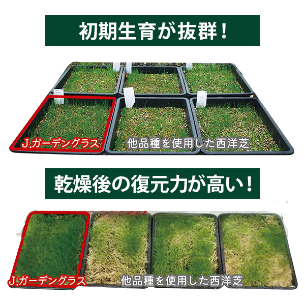 多品種を使用した西洋芝と比べ、発芽後の初期育成が抜群に優れています。