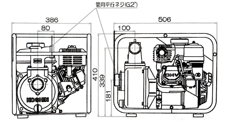 | 吐出口径 | 50mm(2インチ) | 定格出力 | 2.9kW(3.9PS)/3600rpm | ||