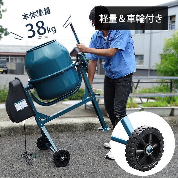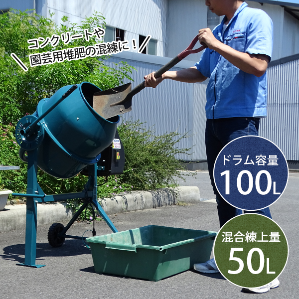 ドラム容量100L、練上量50Lで、コンクリート・モルタルの混練や園芸用の堆肥・肥料の混練に最適です。