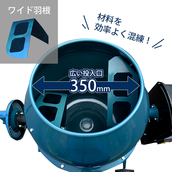 セメント等を投入しやすい広い投入口と、高効率なワイド羽根により、仕上がりの良い混練が可能です。