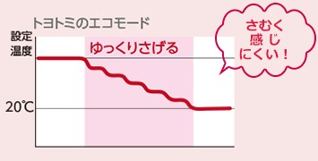 エコモード室温を徐々に20℃までゆるやかに下げるので、体感的に寒く感じにくくなります。