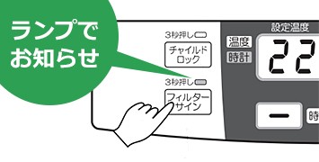 フィルターサインフィルターの目づまりが気になる頃にランプでお知らせします。