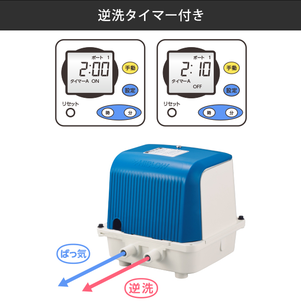 主に高度処理型合併浄化槽向けで、ばっ気ノズルから吐出している空気を、タイマー設定された一定の時間だけ、逆洗ノズルから吐出します。