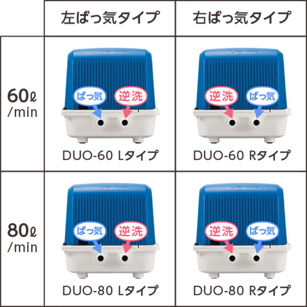 吐出口と向かい合って見たときに、左側ノズルからばっ気するものが「左ばっ気タイプ」、右側ノズルからばっ気するものが「右ばっ気タイプ」となります。ご使用の浄化槽がどちらのばっ気方向が適合かご確認ください。