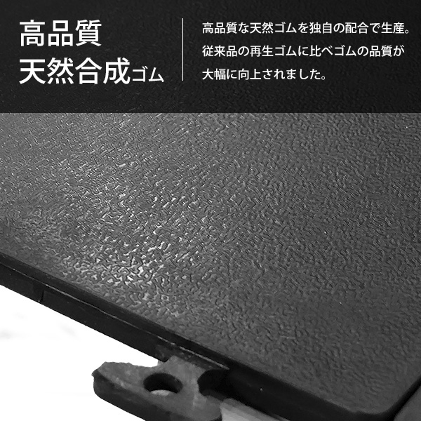 国内一流タイヤメーカーでも使用される高品質な天然ゴムを独自の配合で生産。従来品の再生ゴムに比べゴムの品質が大幅に向上されました。また環境に配慮したリサイクル材料で作られています。