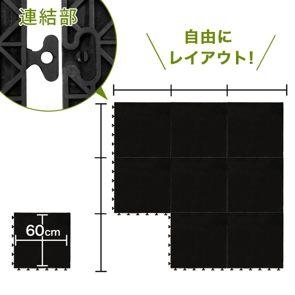 使用する用途に応じて敷きたい所に自由に連結して使え、歩行用・養生用・緩衝材用等、幅広い用途に使えます。 また、コンパクトな600角マットで、狭い場所や建物の角にも簡単に設置できます。
