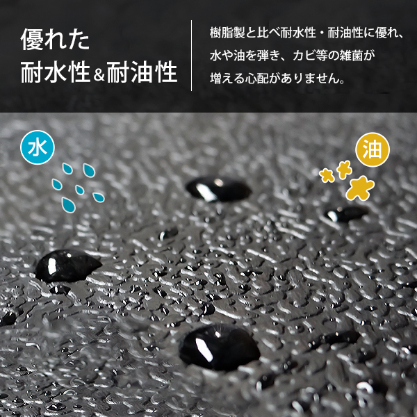 樹脂製と比べ耐水性・耐油性に優れ、水や油を弾き、カビ等の雑菌が増える心配がありません。
