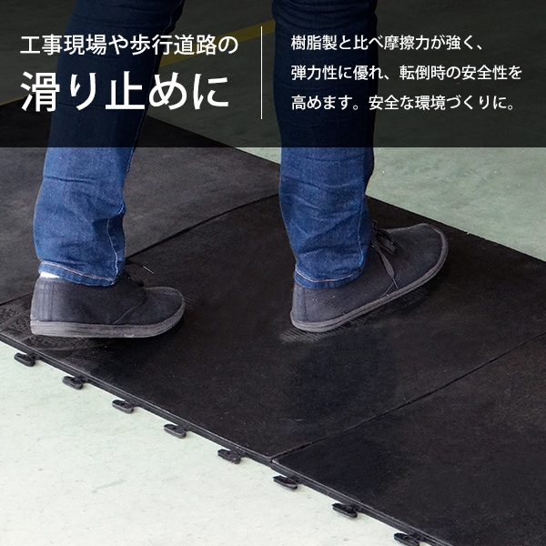 樹脂製と比べ摩擦力が強く、弾力性に優れ、転倒時の安全性を高めます。建設現場や厨房・歩行通路など安全な環境づくりに。