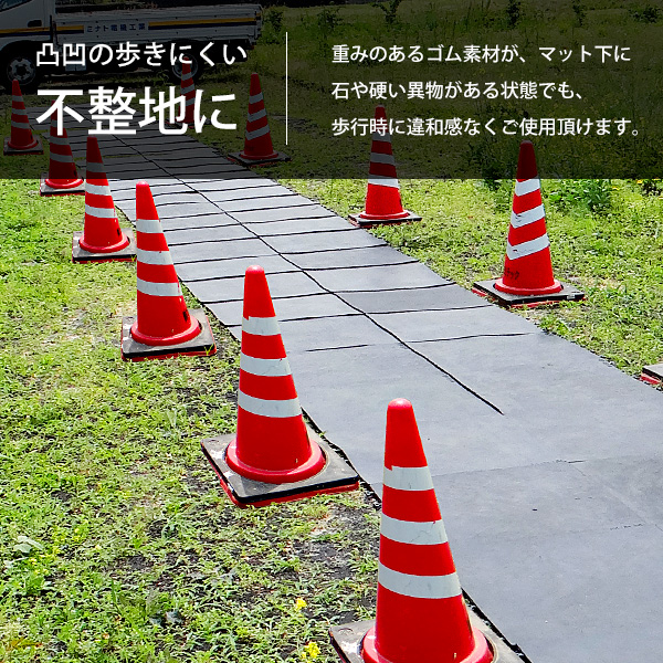 重みのあるゴム素材が、マット下に石や硬い異物がある状態でも、歩行時に違和感なく安心してご使用頂けます。