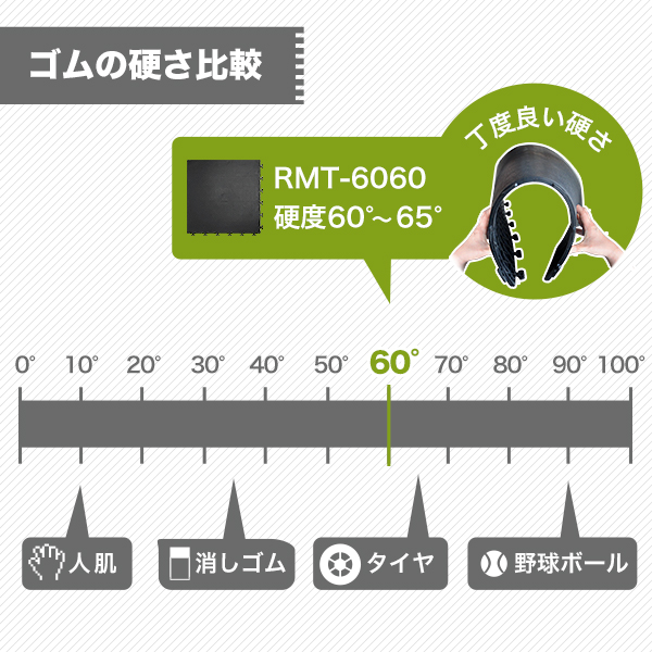 硬すぎない程よい硬さの硬度60°〜65°を採用。地面にフィットしやすく、さまざまな場面で活躍します。