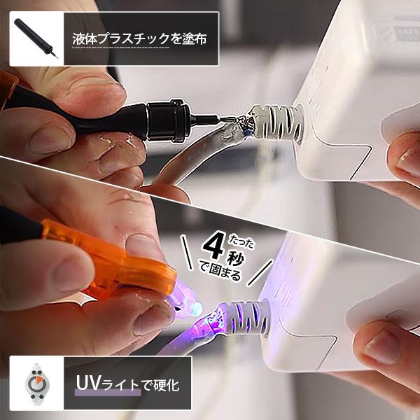 液体プラスチックを塗って付属のUVLEDライトを当てればたった4秒で硬化します。その場でスピーディに簡単に修復が可能です。 -