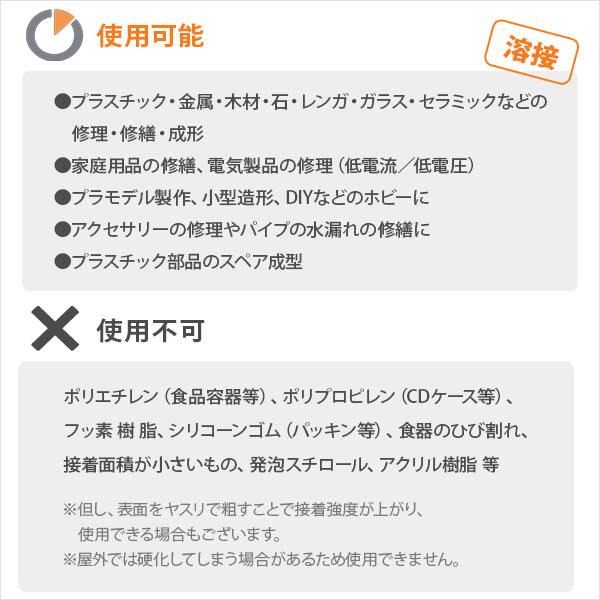 用途 BONDIC 接着剤 欠けた部分を埋めて修復する。 ○ × 一時的または永久的に物を固定する。 ○ △ 面によって接着の強さを調整する。 ○ △ 切り目などを付けて接合する。 ○ × 充填・密封する。 ○ △ 埋め込んで燃やしてもカスが残らない(型取り) ○ × フライス加工、やすり掛け、