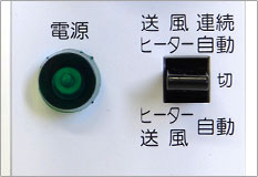 本体の電源スイッチを(送風・ヒーター自動)側に入れ温度調節ツマミを希望位置に合わせますと、温度調節器によって自動運転となり、希望温度に達すると、ヒーターとファン両方が同時に停止します。