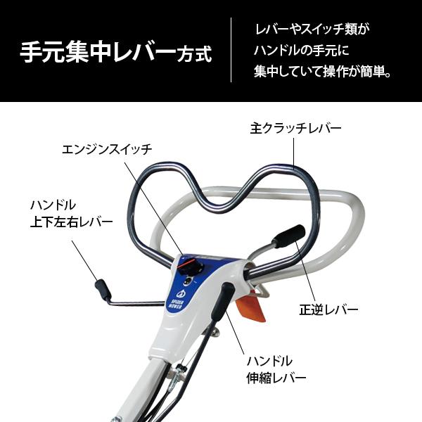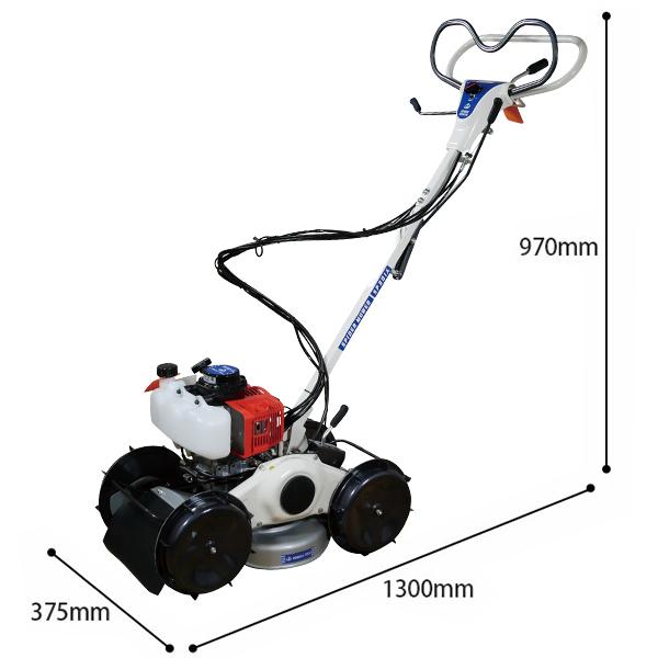 後進2段 [1]1.34 [2]2.02作業能率(反/時間) [1]0.4 [2]0.6 ハンドル伸縮長さ 450mm・4段階 ハンドル調節 上下7段 左右7段 車輪 特殊スパイク鉄車輪 旋回 往復 刈刃形状 フリーナイフ4枚