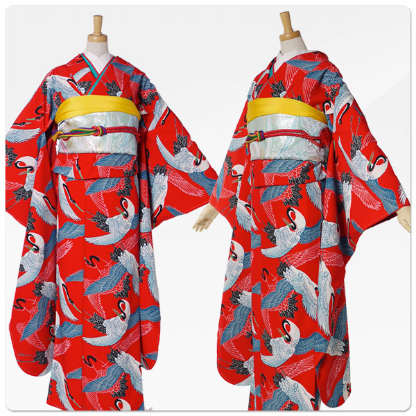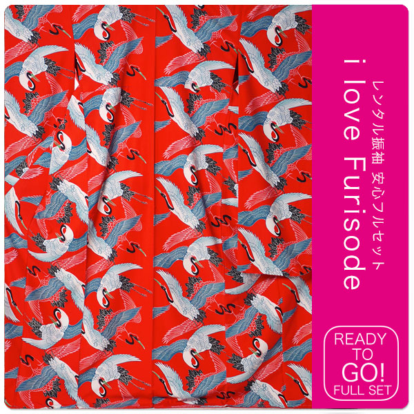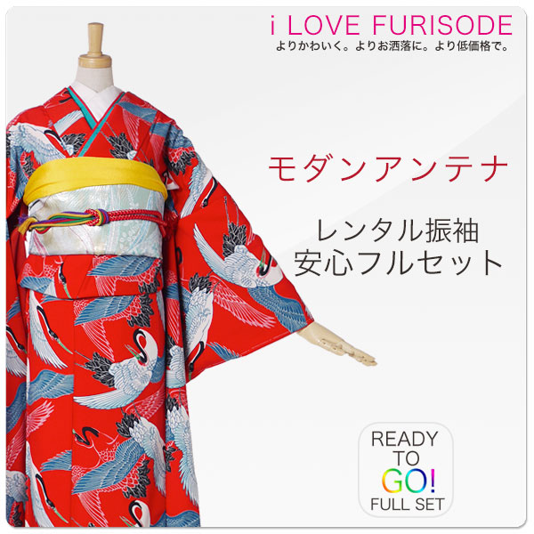 レンタル 振袖 フルセット 貸衣装 モダンアンテナ ブランドNo.1369 レトロ 古典 鶴 赤