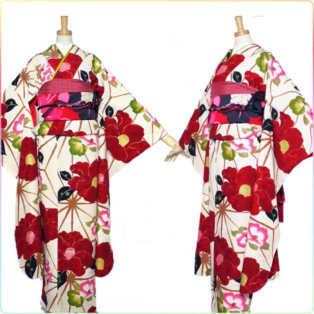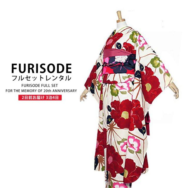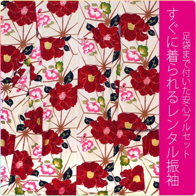 画像の帯がセットになる 紅一点 ブランド レンタル 振袖 フルセット 貸衣装 フリーサイズ 古典 椿 クリーム系 No.1469
