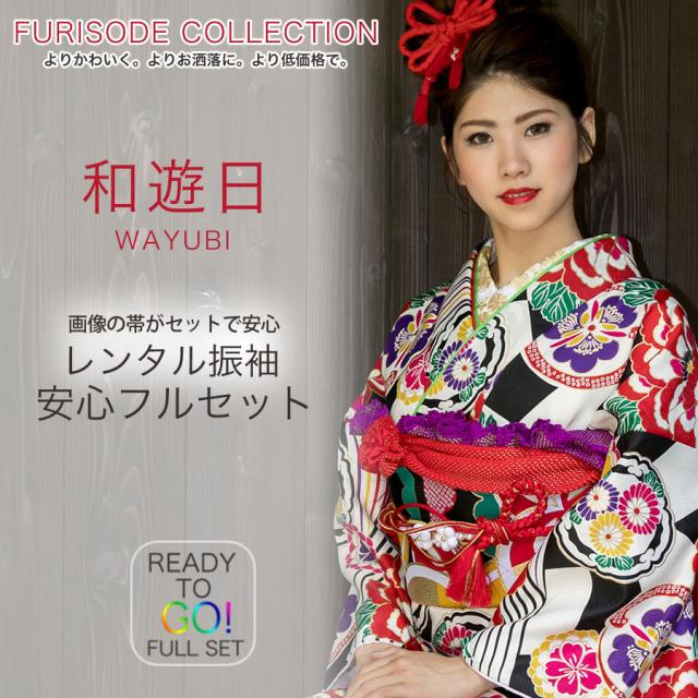 レンタル 振袖 貸衣装 フルセット 貸衣装 画像の帯がセット 和遊日No.1482 黒 白 古典