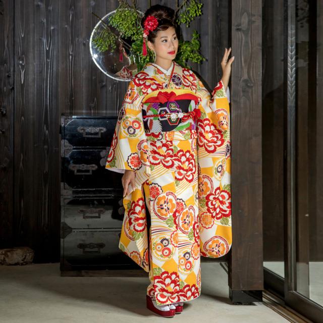 レンタル 振袖 貸衣装 フルセット 貸衣装 画像の帯がセット 和遊日No.1483 黄色 オレンジ 古典