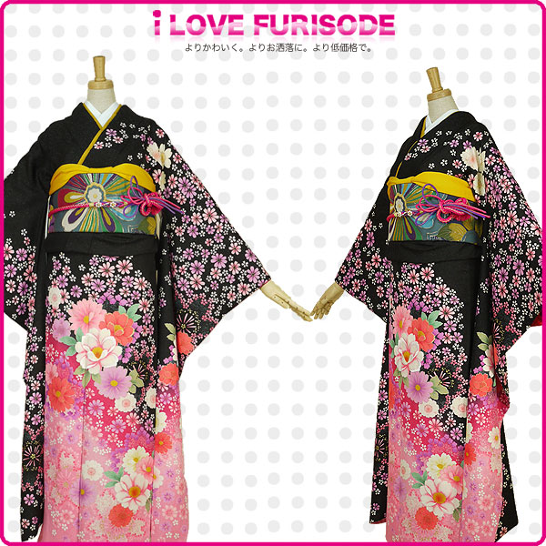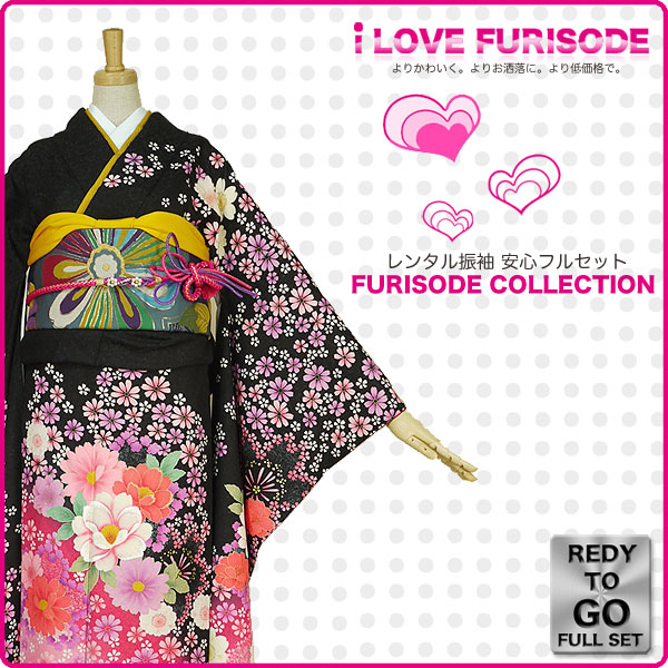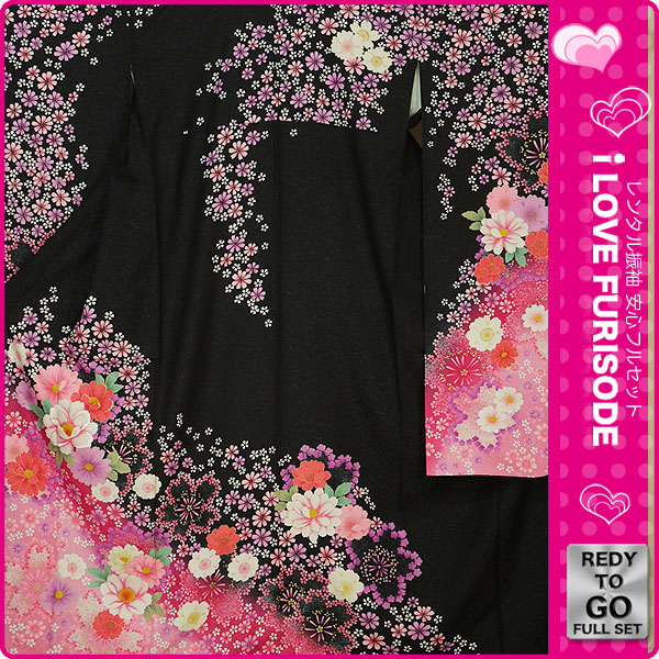 レンタル 振袖 フルセット 貸衣装 黒 ブラック black No.418 振袖 適応身長:160〜170cm位