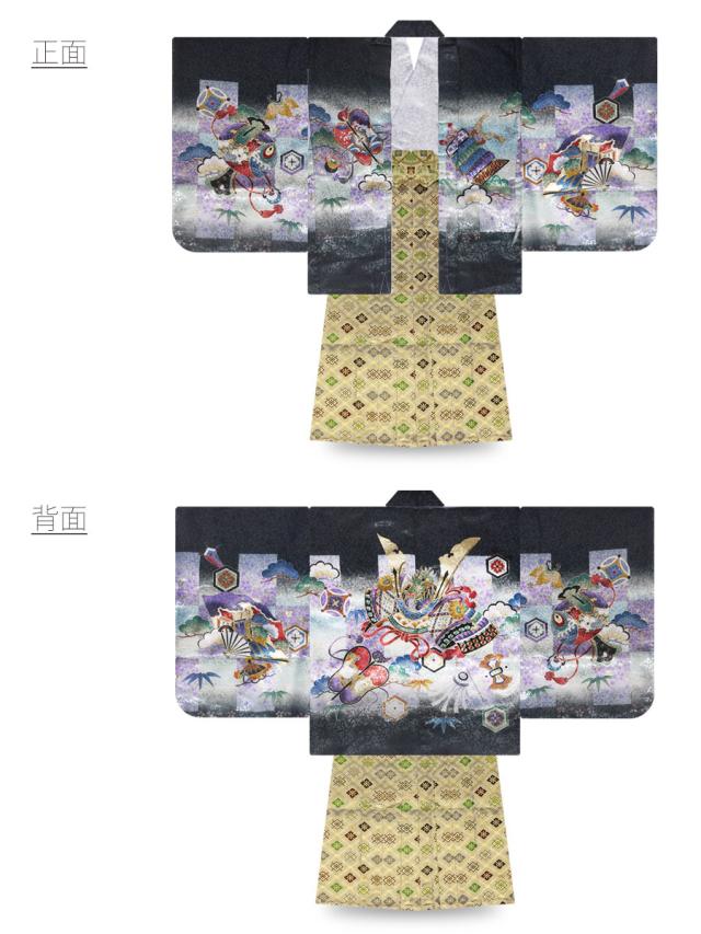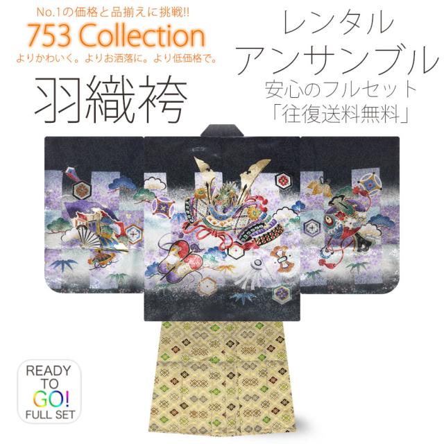 七五三 レンタル 着物 5歳 羽織袴 カンタン着付け アンサンブル 五歳 貸衣装 七五三 子供 男児 男の子 往復送料無料 刺繍 兜 市松 黒