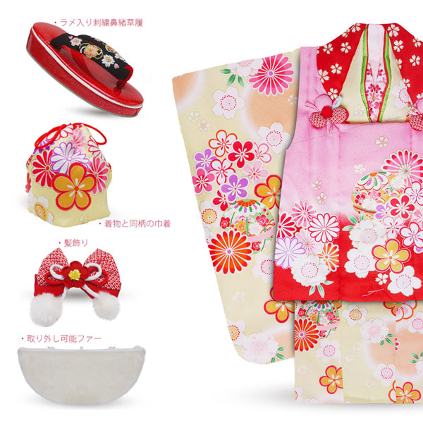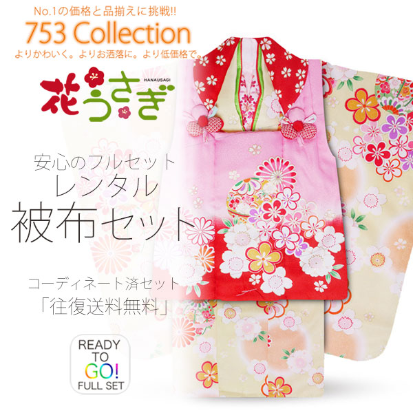 花うさぎ 被布コート レンタル 3歳 三才 貸衣装 七五三 子供 女児 セット 往復送料無料 クリーム 赤 白
