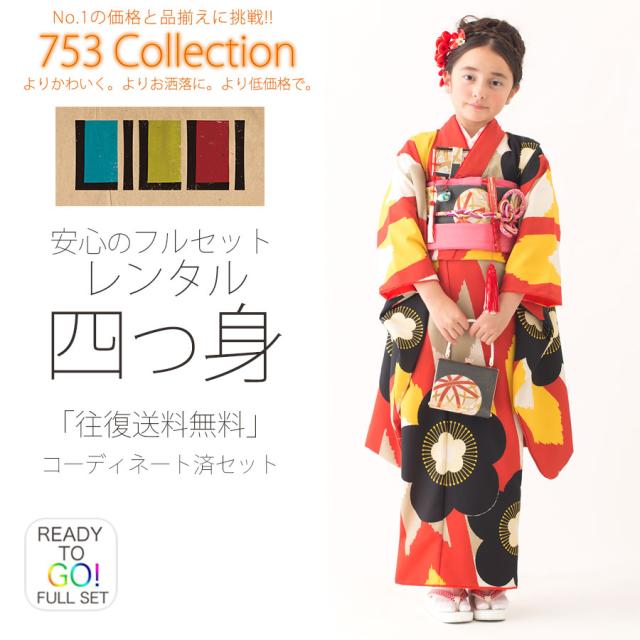 新LILLI 七五三 レンタル 四つ身 着物 七五三 貸衣装 女児 和服 セット 古典 往復送料無料 黒 橙 梅