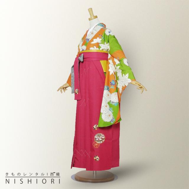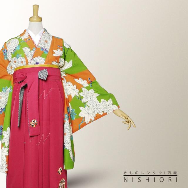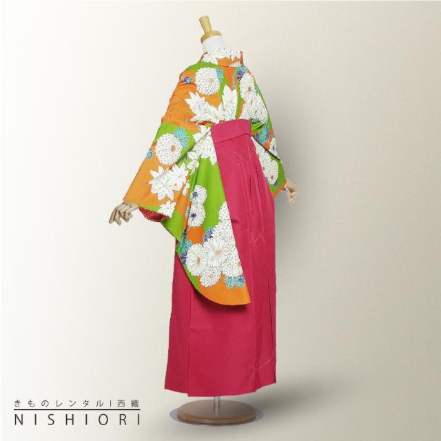 二尺袖 着物 袴 レンタル 貸衣装 九重 緑 オレンジ 椛 刺繍 袴 M サイズ 小学生 対応 ブーツ選択可