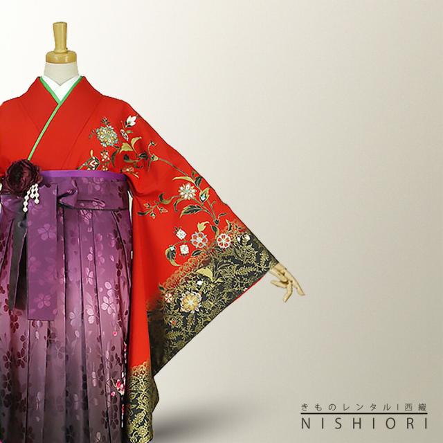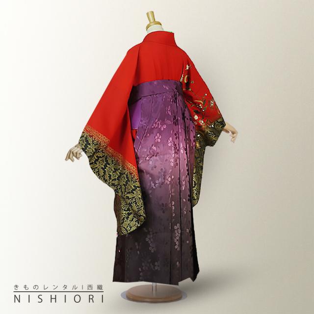 二尺袖着物 袴 レンタル 貸衣装 HL 赤×紫×ボカシ×刺繍 袴 小学生 対応 ブーツ選択可