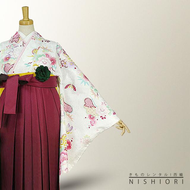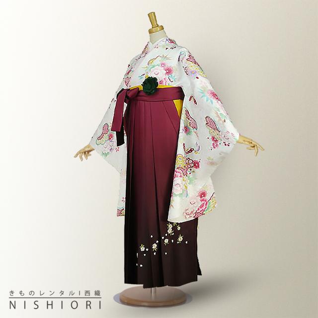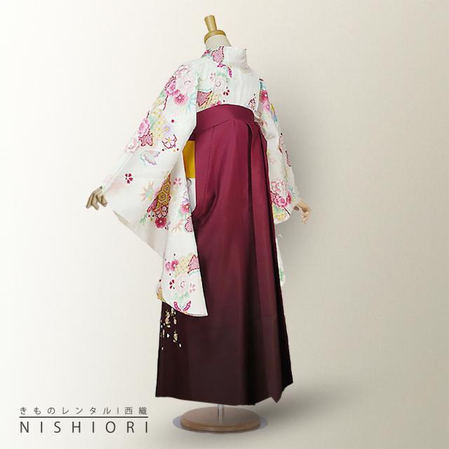 二尺袖着物 袴 レンタル 貸衣装 白×ワイン×ボカシ×刺繍 袴 Lサイズ 小学生 対応 ブーツ選択可