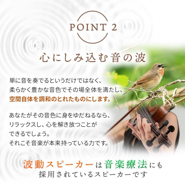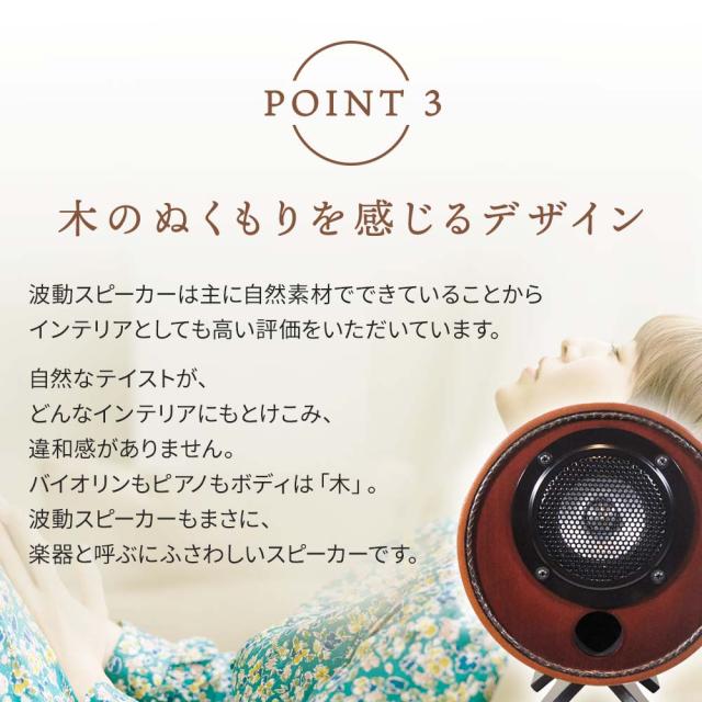 最先端の波動エネルギー技術を導入することにより、今までのスピーカーでは実現できなかったリアルで臨場感あふれる音場を生み出すことに成功しました。