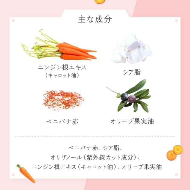 ニンジン根エキス(キャロット油)、ベニバナ赤、シア脂、オリーブ果実油、オリザノール(紫外線カット成分)