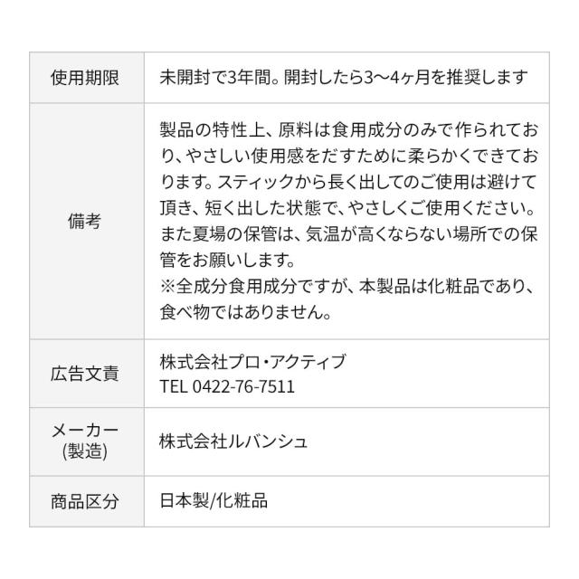 [備考]製品の特性上、原料は食用成分のみで作られており、やさしい使用感をだすために柔らかくできております。スティックから長く出してのご使用は避けて頂き、短く出した状態で、やさしくご使用ください。また夏場の保管は、気温が高くならない場所での保管をお願いします。※全成分食用成分ですが、本製品は化粧品であり、食べ物ではありません。