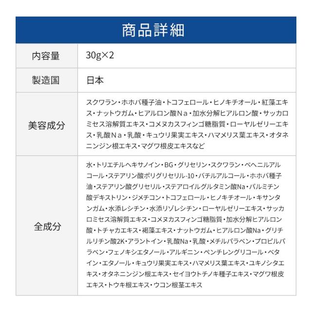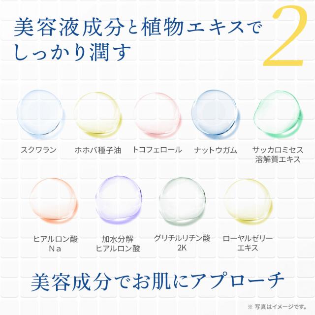 | 美容成分 | スクワラン・ホホバ種子油・トコフェロール・ヒノキチオール・紅藻エキス・ナットウガム・ヒアルロン酸Na・加水分解ヒアルロン酸・サッカロミセス溶解質エキス・コメヌカスフィンゴ糖脂質・ローヤルゼリーエキス・グリチルリチン酸2K・アラントイン・乳酸Na・乳酸・キュウリ果実エキス・ハマメリス葉エキス・オタネニンジン根エキス・マグワ根皮エキスなど |