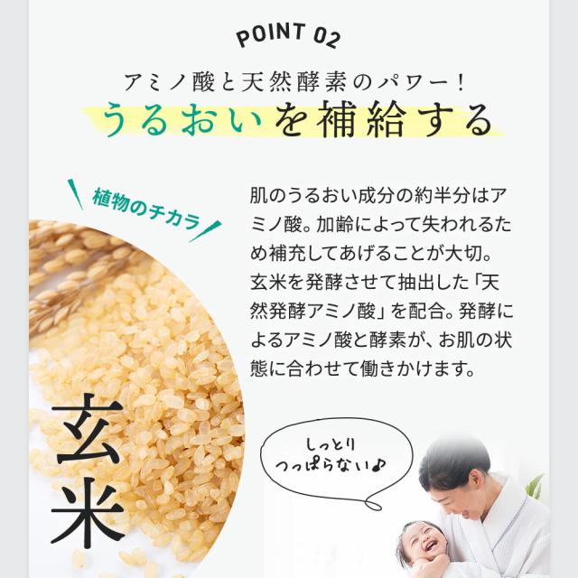 玄米を発酵させて抽出した「天然発酵アミノ酸」を配合。発酵によるアミノ酸と酵素が、お肌の状態に合わせて働きかけます。