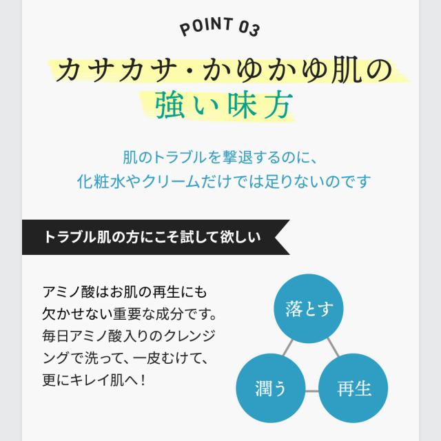 アミノ酸はお肌の再生にも欠かせない重要な成分です。毎日アミノ酸入りのクレンジングで洗って、一皮むけて、更にキレイ肌へ!
