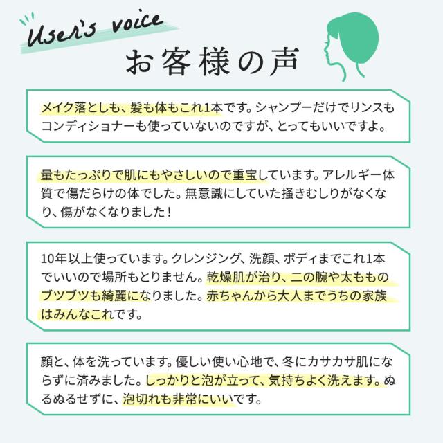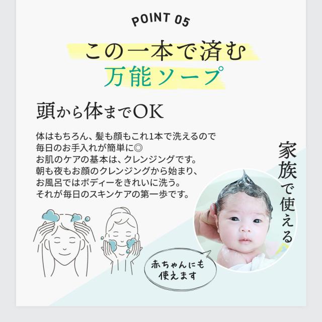 デリケートなお肌に安心な天然植物性で顔も体も洗え無香料・無着色・無防腐剤だから<安心して家族みんなで使えます。
