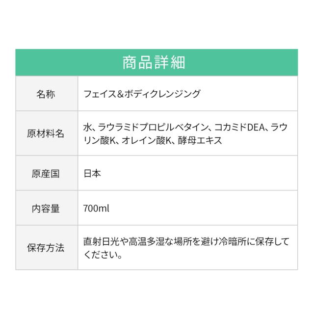 成分表:水,ラウラミドプロピルベタイン,コカミドDEA,ラウリン酸K,オレイン酸K,酵母エキス
