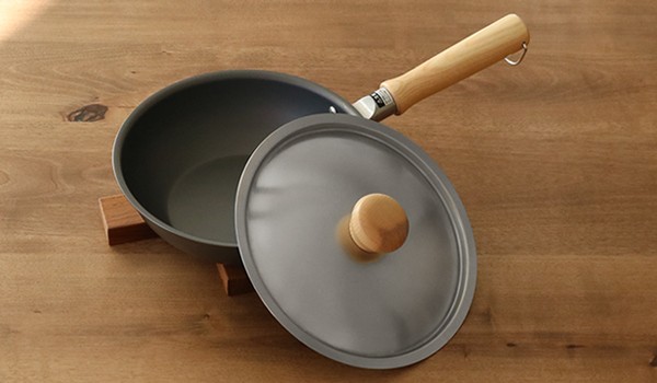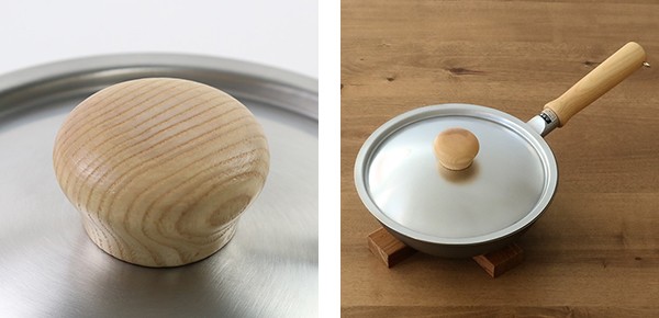 ツマミは熱くなりにくく掴みやすい木製です。取っ手が木製のフライパンとの相性もばっちりです。