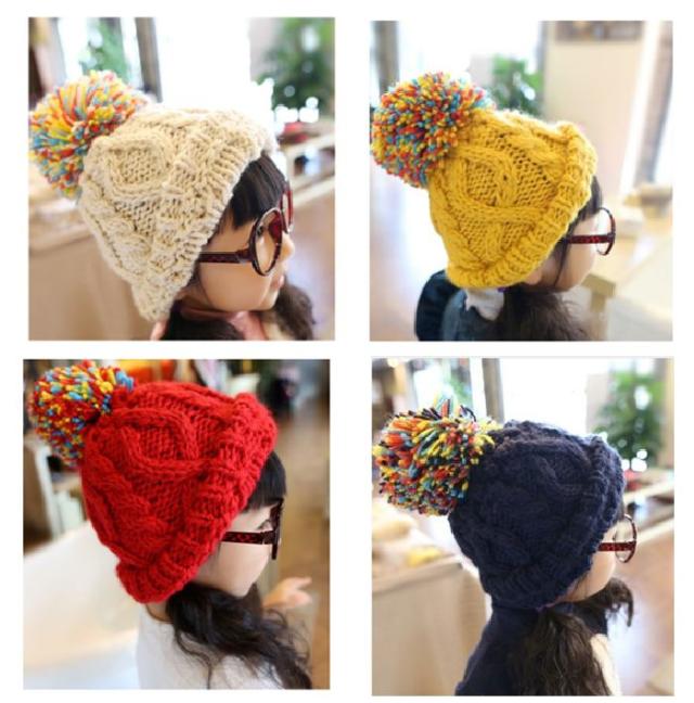 ミックスカラーの大きなボンボンがポイント☆太めの毛糸で大きな編み模様☆やわらかニットでチクチクしない
