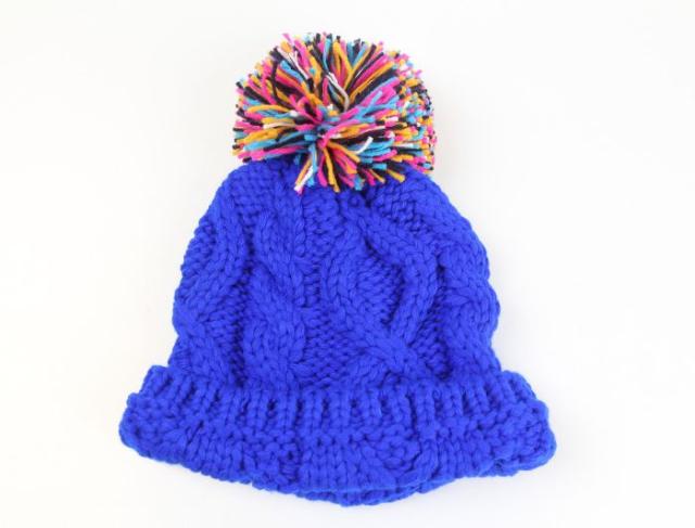 ・ミックスカラーの大きなボンボンがポイント☆太めの毛糸で大きな編み模様