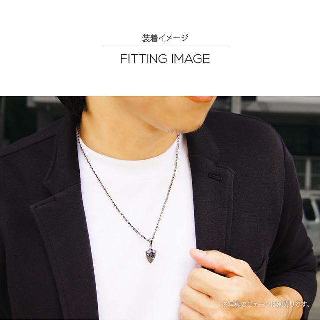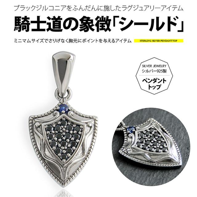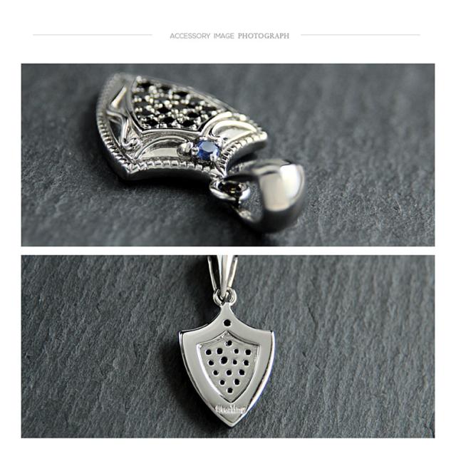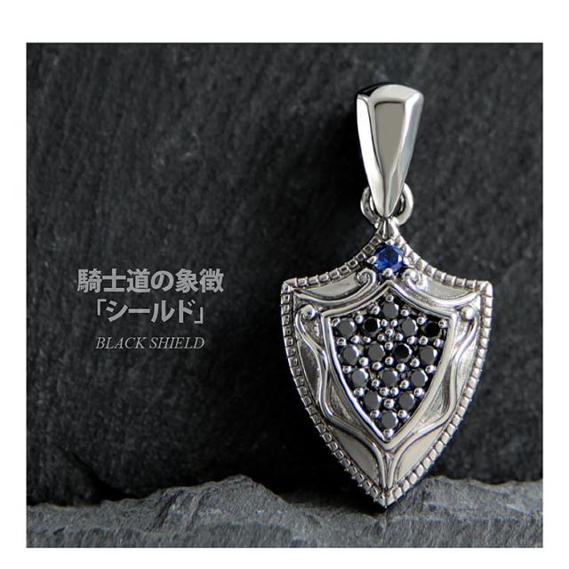シルバー925に希少金属(レアメタル)のブラックルテニウムでコーティングした盾(シールド)モチーフのペンダントトップです。盾の上部中央には人工サファイア、盾の中にはブラックジルコニアをふんだんに施したラグジュアリーな一品で、ゴージャスでありながらもミニマムサイズでさりげなく胸元にポイントを与えるアイテムです。モチーフの盾は中世ヨーロッパでは騎士道の象徴であり、現在でも勇者・勝者の象徴として使われることが多く、大切なものを守る力のモチーフなので男性にオススメのアクセサリーです。