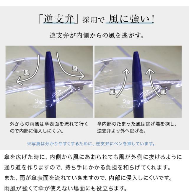 傘の内側から風を外に逃がす「逆支弁」で特許(第5285402)取得し、本体に採用したことで通常の傘に比べて裏返りを軽減。雨風が強いと、どうしても前かがみになってしまいますが、全面ビニールで視界良好なので安全です。