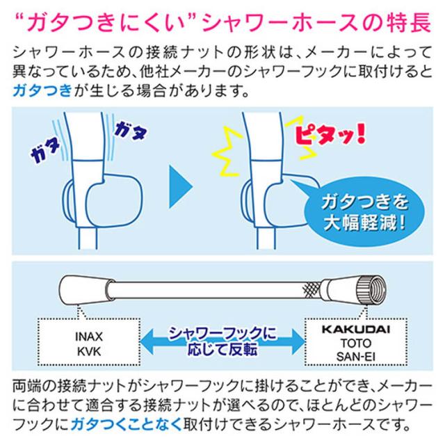 ●シャワーホース。●ほとんどのメーカーのシャワーフックとのガタつきを軽減するシャワーホースです。●シャワーヘッド側の金具が回転するので、ホースのねじれを防ぎます。●工具不要で取付簡単、ほとんどのメーカーのホースと交換できます。●シャワーヘッド側アダプターは、KVK・MYM用の2種類を同梱しています。●混合栓側アダプターは、TOTO(細ホース)・TOTO(太ホース)・TOTO(樹脂エルボ)・KVK用・G1/2ネジ用の5種類を同梱しています。