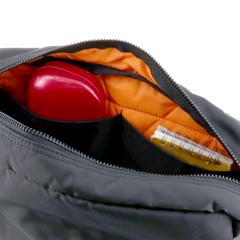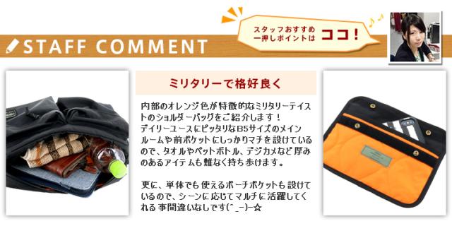 | シンプルな見た目に反した内側の鮮やかなオレンジカラーは、ミリタリージャケットのライニングをイメージしており、また、軽さ・柔らかさは正に一級品! こちらはB5サイズ対応ですが、メインルーム・フロントポケット共にたっぷりのマチを設けているので、見た目以上の収納力を発揮! 更に、ショルダーストラップは着脱可能な作りになっているので、クラッチ風に持ち歩く事も! 内側には取り外し可能なポケットが設けられており、ポーチとしてもお使い頂けます。 |