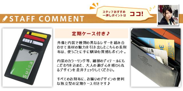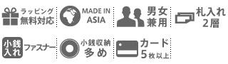 | 備考 | 【メイン開閉】オープン 内側/ 札入れ×2 フリーポケット×3 ファスナー小銭入れ×1 カードポケット×6 付属/ カードケース×1(クリアポケット×1、カードポケット×3) | ||