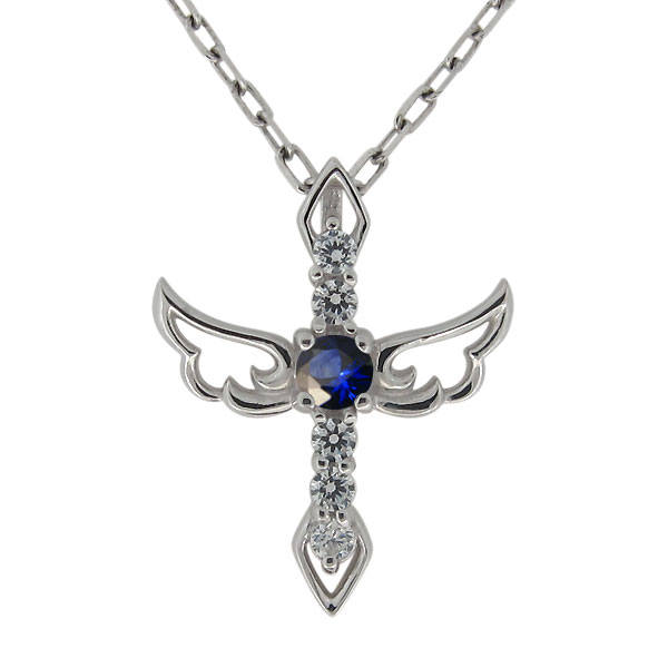 9月誕生石サファイアを使用したシルバー製の、羽根(フェザー)・十字架(クロス)モチーフネックレス・ペンダントです。