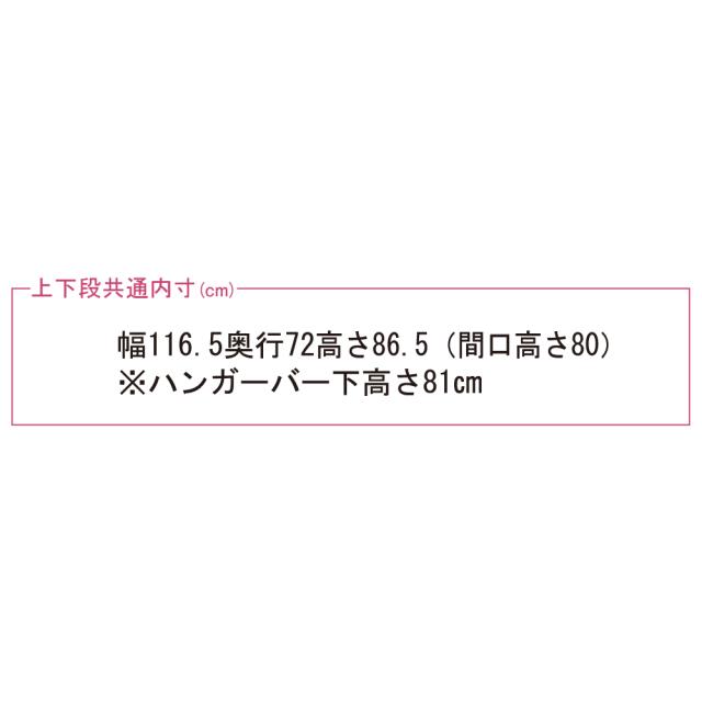 ■サイズ:幅120奥行77高さ180cm・重量約68kg、内寸(上下段共通)幅116.5奥行72高さ86.5(間口高さ80)cm、ハンガーバー下高さ81cm