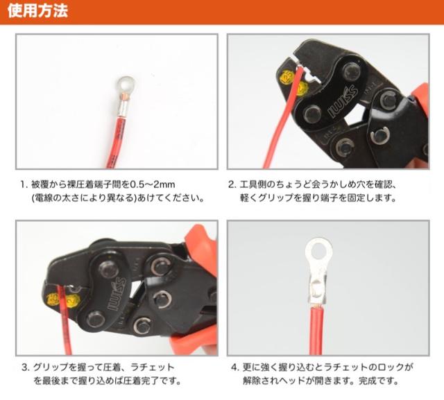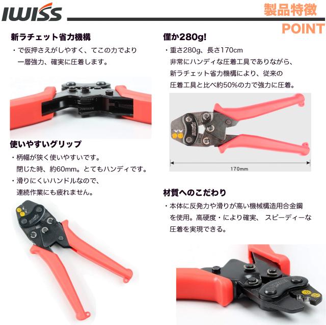 アイウィス社裸圧着端子、裸スリーブ用圧着工具になります。僅か280gでありながら新ラチェット構造で比べ約50%の力で圧着できますので、作業者の負担が軽くなります。